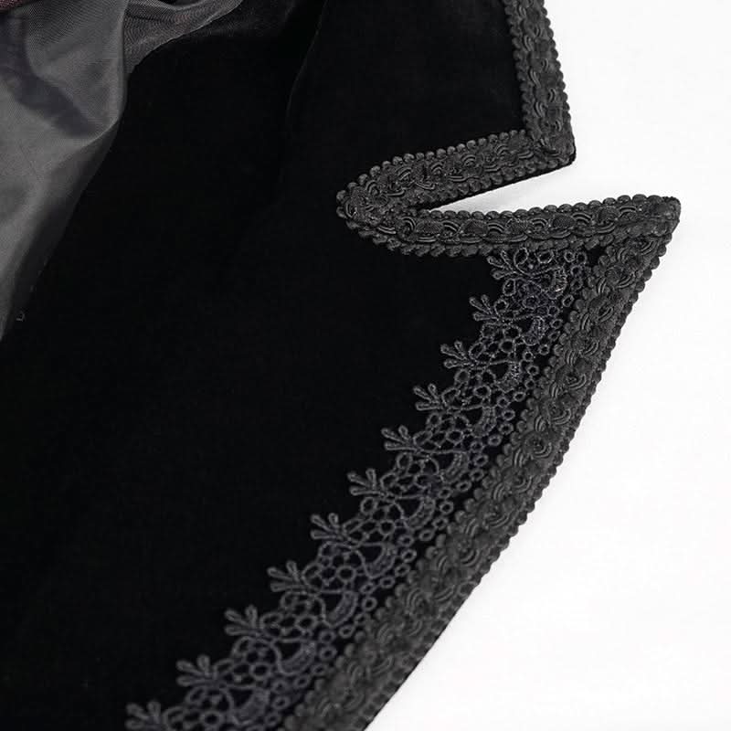 The coat is adorned with a delicate lace border along the collar, enhancing its romantic yet edgy appeal. With stylish buttons gracing the center front, this coat combines functionality with a captivating design. Perfect for layering over your favorite gothic attire, it effortlessly elevates your look for any occasion, whether it’s a night out or a special event.