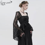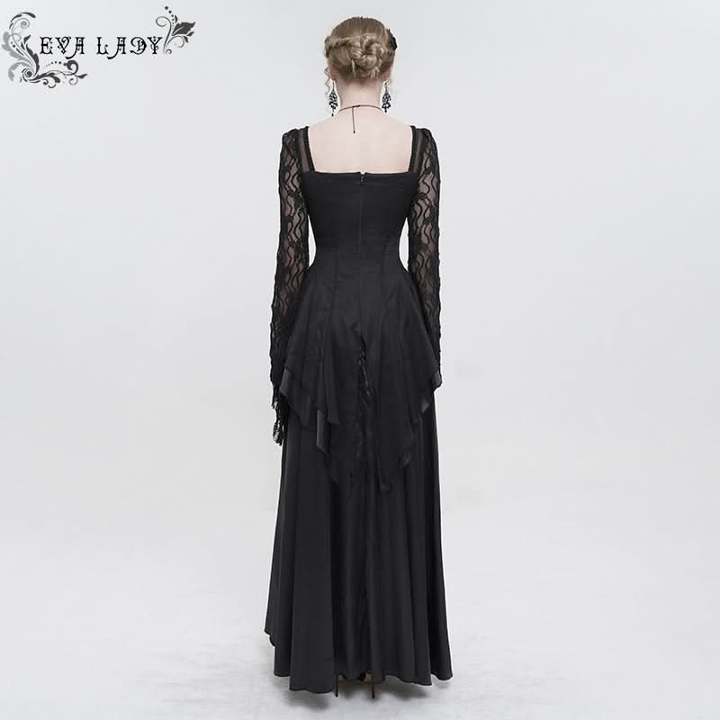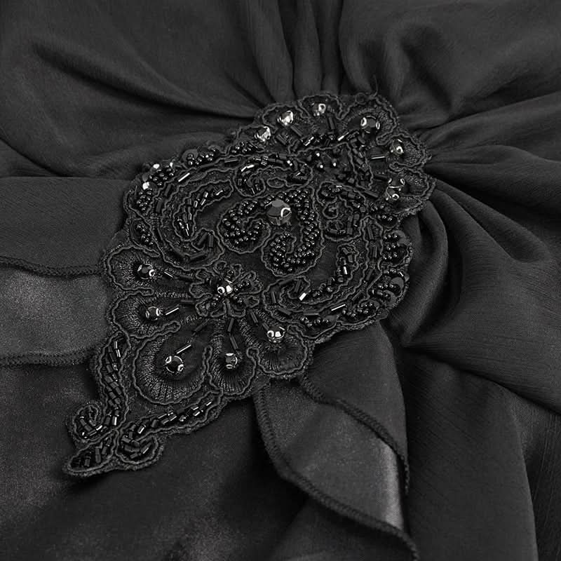 The structured bodice is beautifully bordered with delicate lace, enhancing your figure while adding a touch of sophistication. Full sleeves provide an air of mystery, while the beaded and embroidered gothic patch adds a unique flair that sets this dress apart. Whether you're attending a gothic-themed event or simply want to express your individual style, this dress is sure to turn heads.