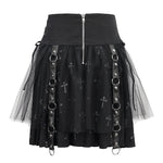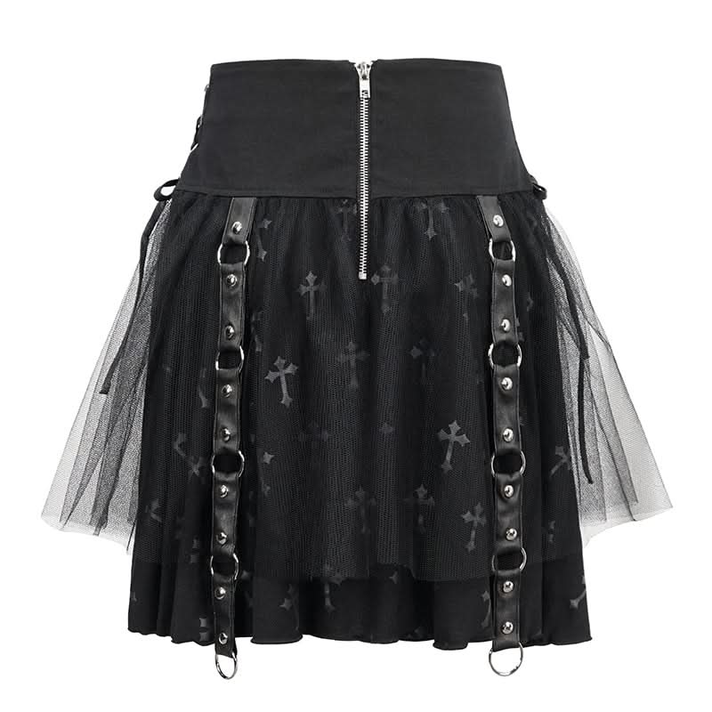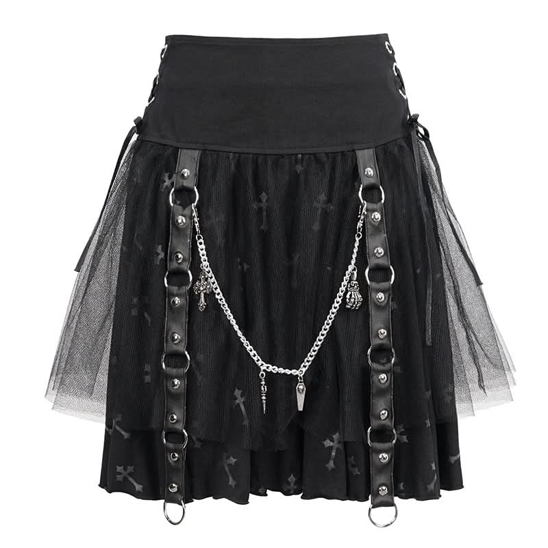 Embrace your dark side with the 'Glum and Done' Gothic Skirt With Chain, a stunning addition to any gothic wardrobe. This captivating skirt features a unique crucifix print that perfectly complements the edgy aesthetic of gothic fashion. The layered design includes a mesh outer skirt that adds a touch of ethereal elegance, making it ideal for both casual outings and more formal gothic events.