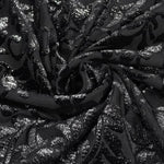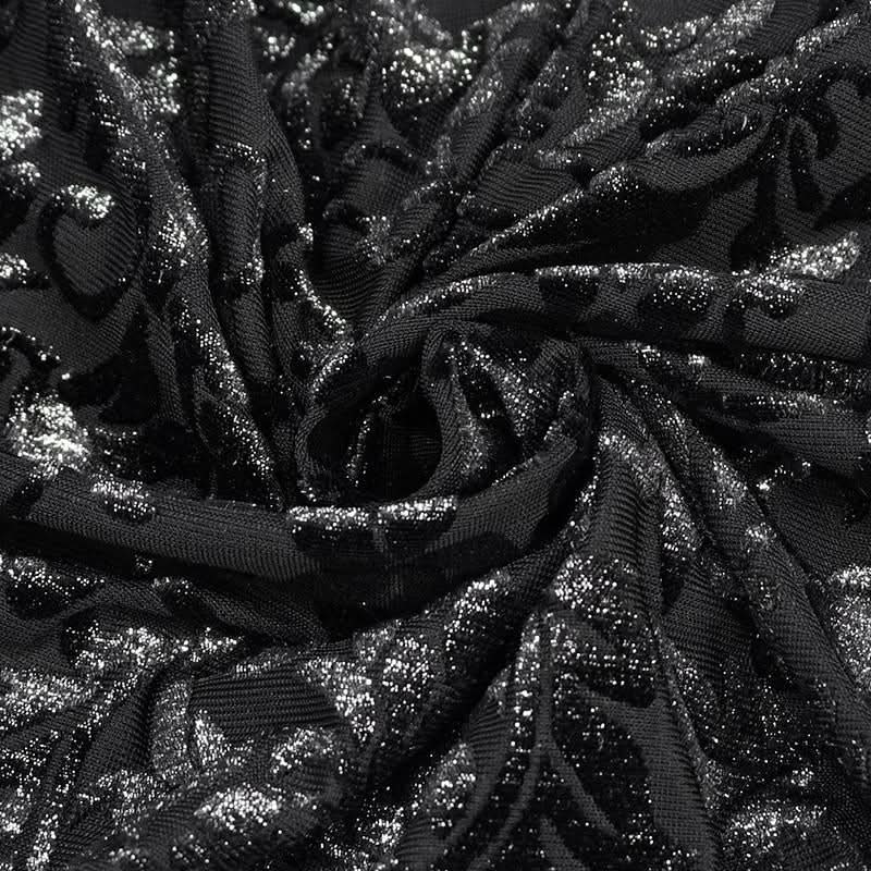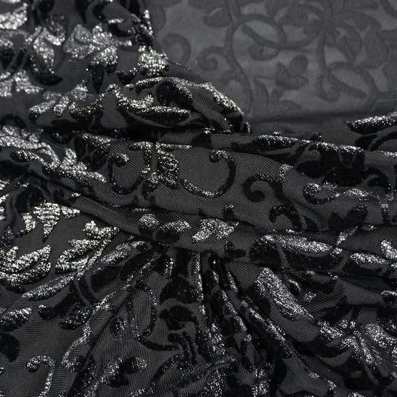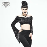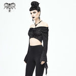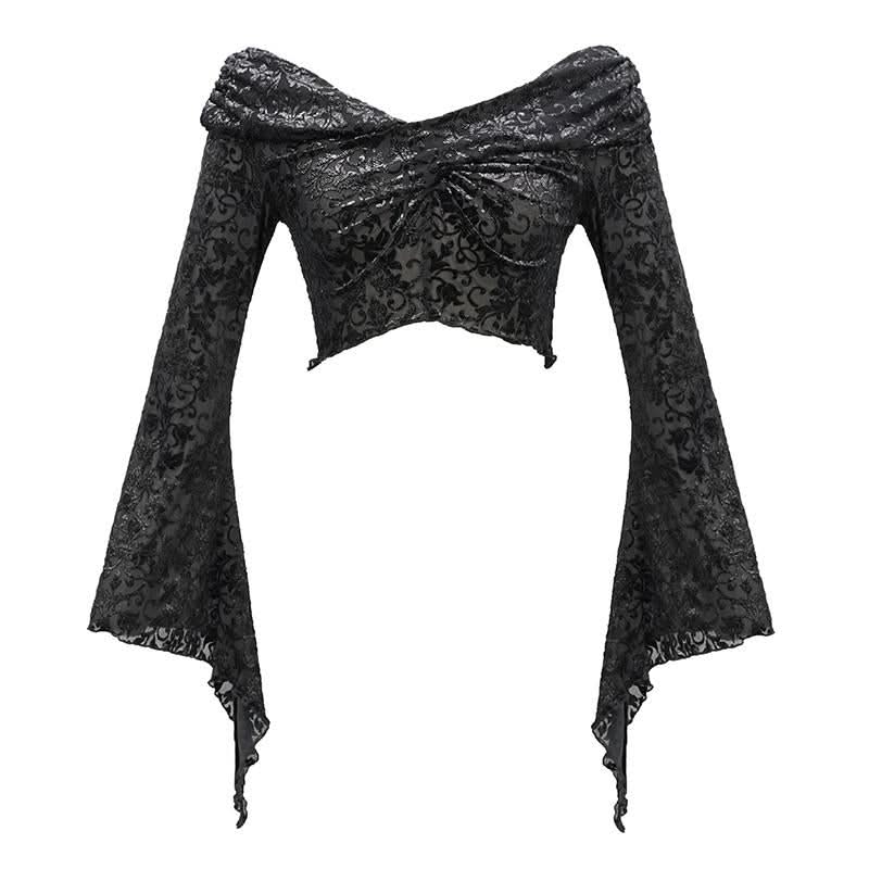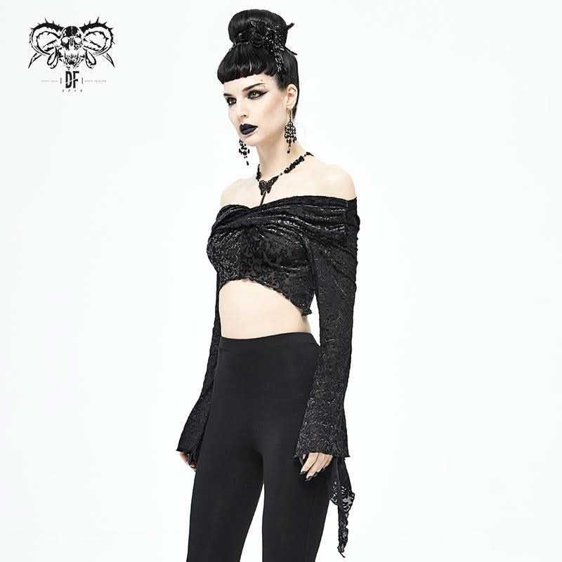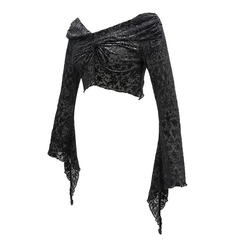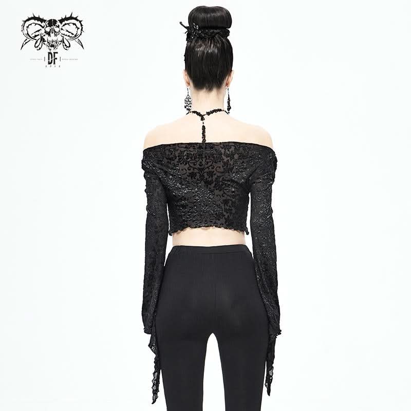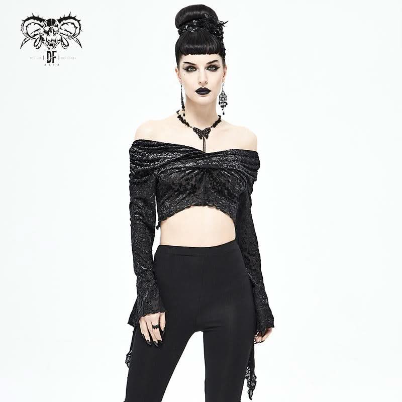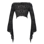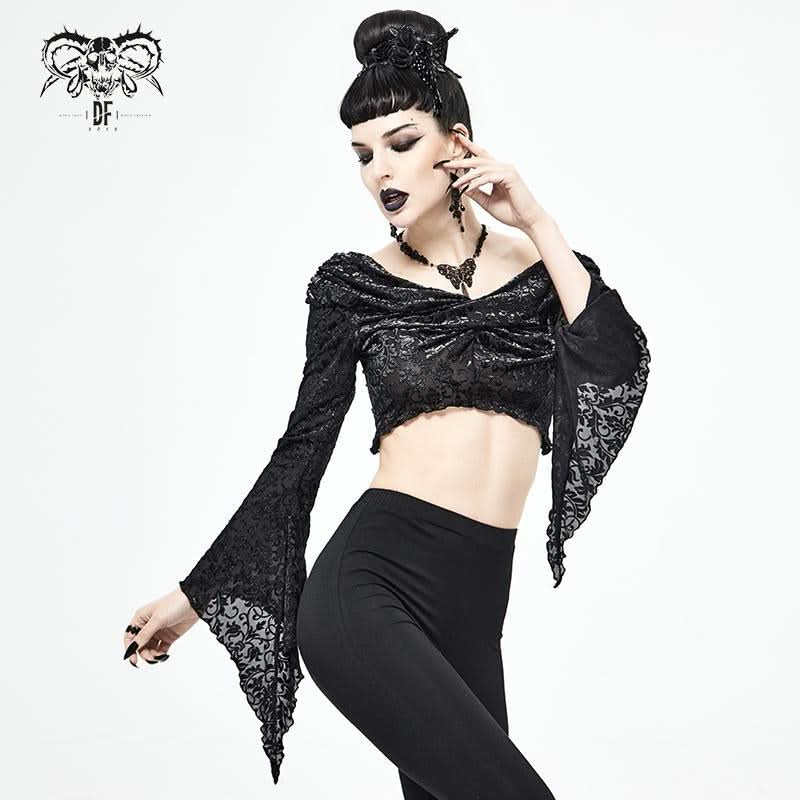 Embrace your dark side with the Mirror Valley Gothic Crop Top, a stunning piece that perfectly embodies gothic fashion. This crop top features an exquisite embossed fabric that adds a touch of elegance to your edgy style. The unique off-shoulder neckline beautifully showcases your collarbones, while the dramatic lantern sleeves create a captivating silhouette that is sure to turn heads.