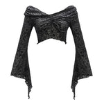 Drape your silhouette in mystery with the exquisite off-shoulder elegance and dramatic lantern sleeves of the Mirror Valley Gothic Crop Top.