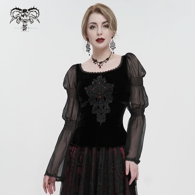 Embrace your dark side with the stunning Her Satanic Wickedness Gothic Velvet Top. This exquisite piece is designed for those who appreciate the allure of gothic fashion, featuring luxurious velvet that drapes beautifully against the skin. The enchanting mesh lantern sleeves add a touch of drama, while the square neckline enhances your silhouette, making it perfect for both casual outings and special occasions.