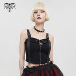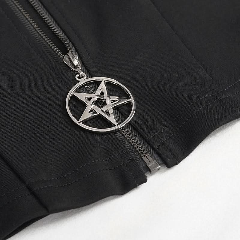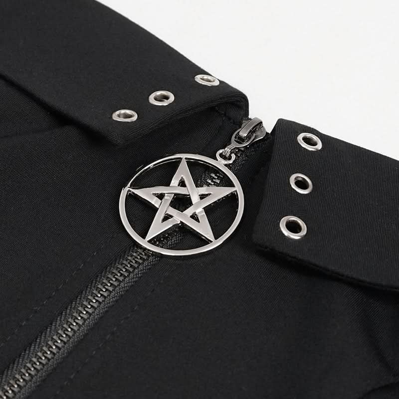 Unleash your inner rebel with the 'Raving Demon' Punk Pentagram Tank Top, a striking addition to your gothic fashion wardrobe. This eye-catching tank top showcases a bold pentagram motif at the center front, making it a perfect statement piece for those who embrace the punk aesthetic. The adjustable suspenders add a unique twist, allowing you to customize your look while ensuring comfort and style.
