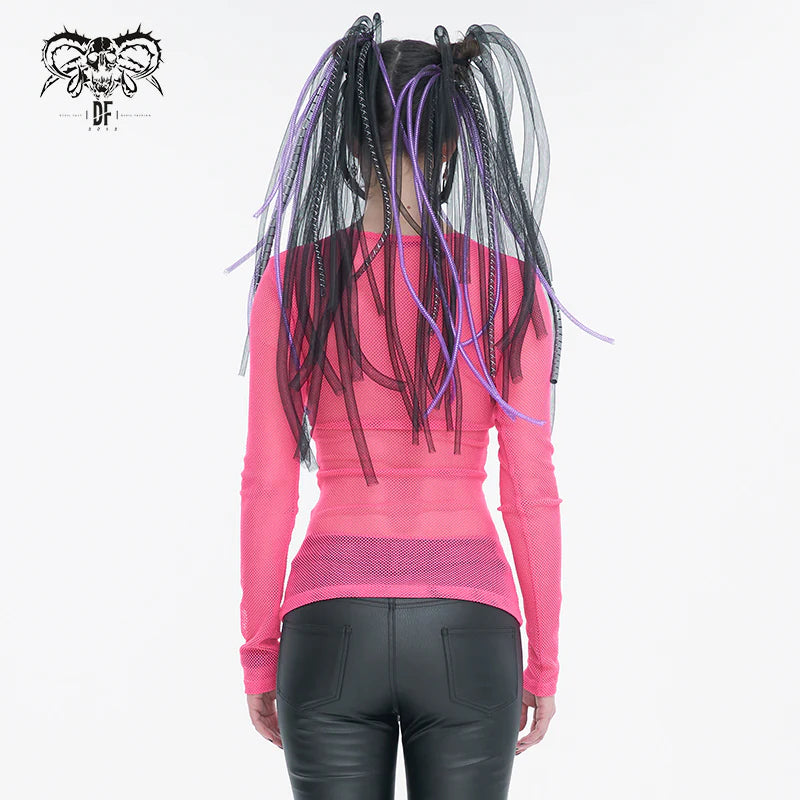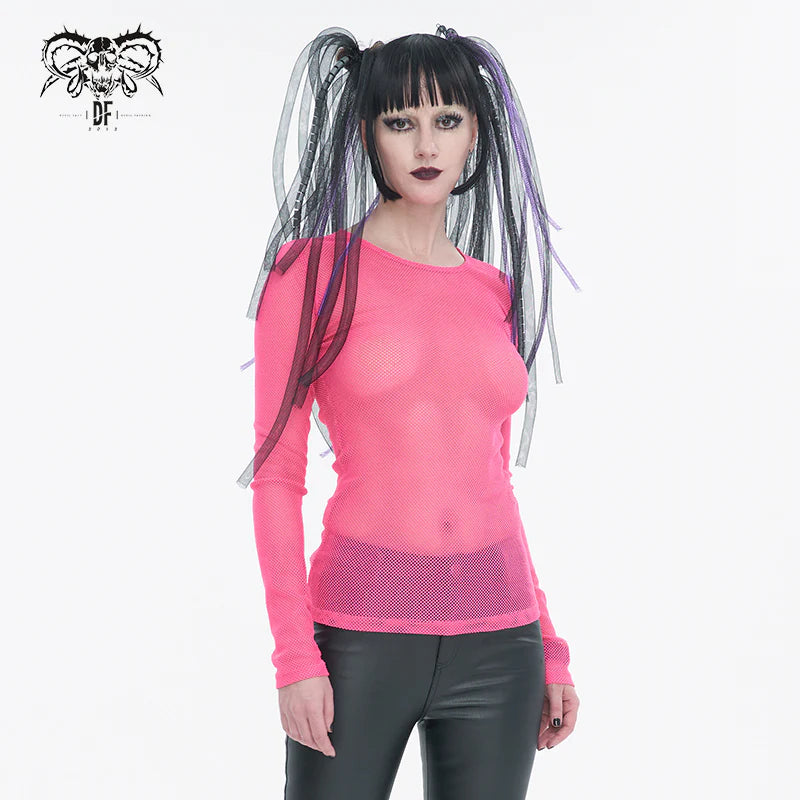 Embrace your inner rebel with the Chemical X Punk Mesh Tee from the Runaways collection. This striking mesh tee is designed for those who dare to stand out, making it a must-have for any gothic fashion enthusiast. With its long sleeves and round neck, this tee offers a unique blend of comfort and edgy style, perfect for layering or wearing solo.