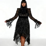 Step into a world of dark elegance with the Wilhelmina Gothic Floral Mesh Dress. This stunning gothic dress captures the essence of Victorian romance, making it a must-have for any gothic fashion enthusiast. Crafted with exquisite floral mesh fabric, it features delicate ruffled cuffs and luxurious velvet embellishments that elevate its charm. The swallowtail design adds a touch of sophistication, making it perfect for semi-formal and formal occasions.