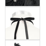 Elevate your gothic fashion ensemble with the stunning Wednesday Gothic Lace Bow Tie in Coal. This exquisite accessory features a textured fabric that exudes elegance, bordered with fringed floral mesh lace for a dramatic flair. The intricate design is perfect for those who embrace the darkly romantic aesthetic, making it an essential addition to any gothic wardrobe.