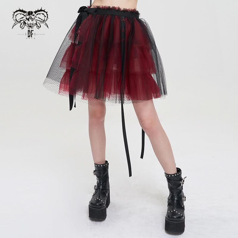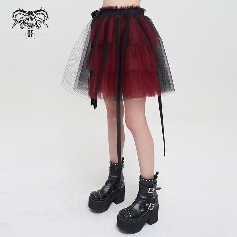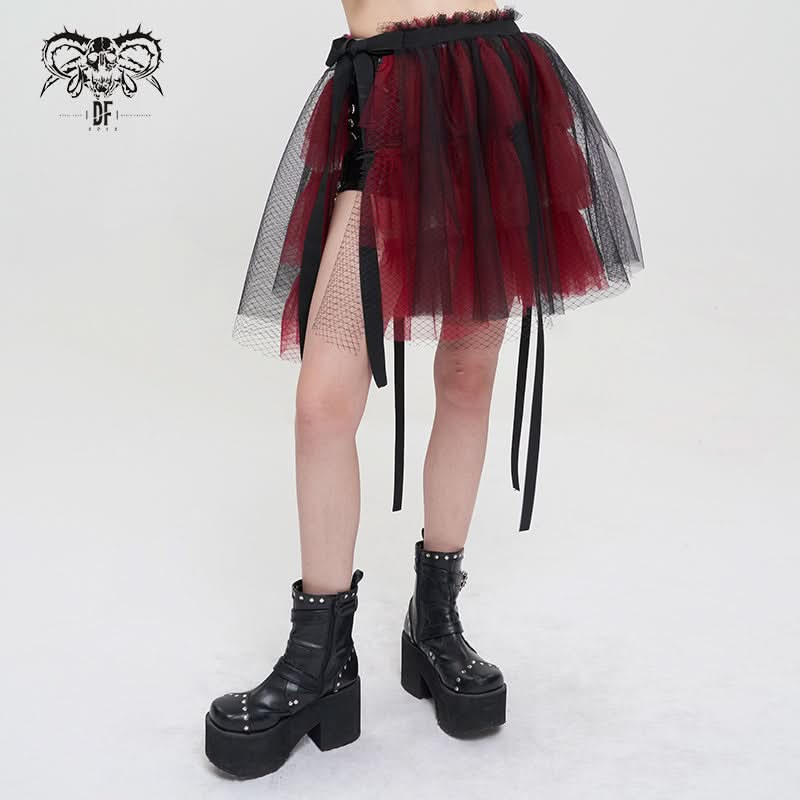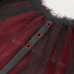 Step into the world of gothic fashion with our stunning Punk Black and Red Flared Skirt. This eye-catching skirt combines bold colors and unique design elements, making it a must-have for any punk-inspired wardrobe. The flared silhouette adds a dramatic flair, while the ruffles and mesh outer layer create an enchanting look that is perfect for both day and night outings.