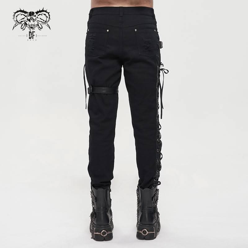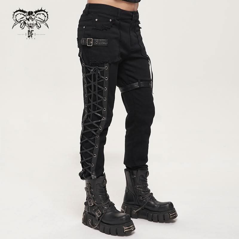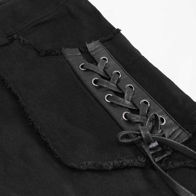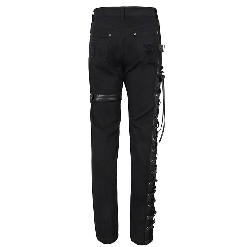 Step into the world of gothic fashion with our Themis Punk Distressed Trousers. These trousers embody the rebellious spirit of punk style, featuring a striking distressed design that sets you apart from the crowd. Crafted with attention to detail, they showcase threaded eyelet panels that add an edgy flair, making them a perfect choice for those who embrace individuality.