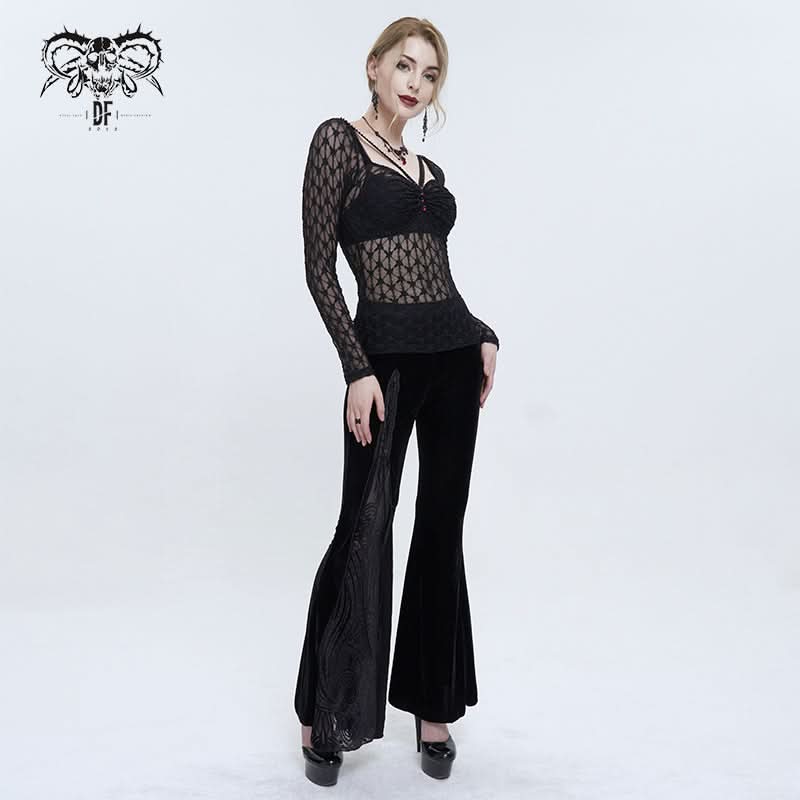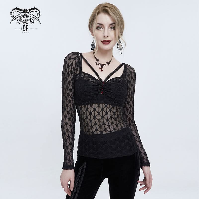 The full sleeves provide a dramatic flair, perfect for layering or wearing on their own. Whether you're heading to a concert, a night out, or simply expressing your individual style, this gothic mesh printed top is versatile enough to suit any occasion. Pair it with your favorite skirt or distressed jeans for a look that’s both edgy and chic.
