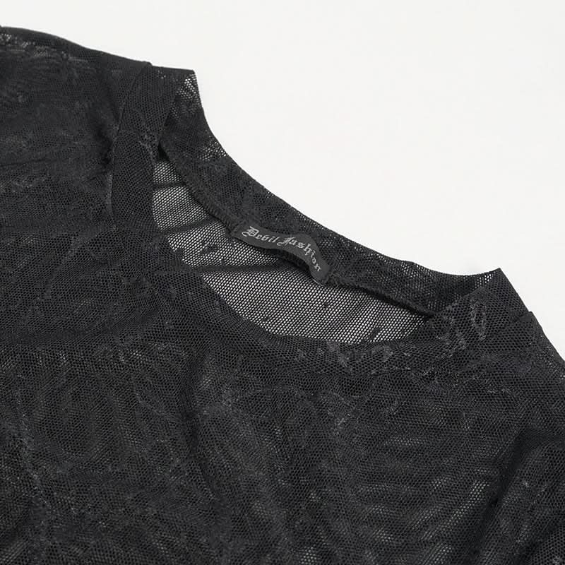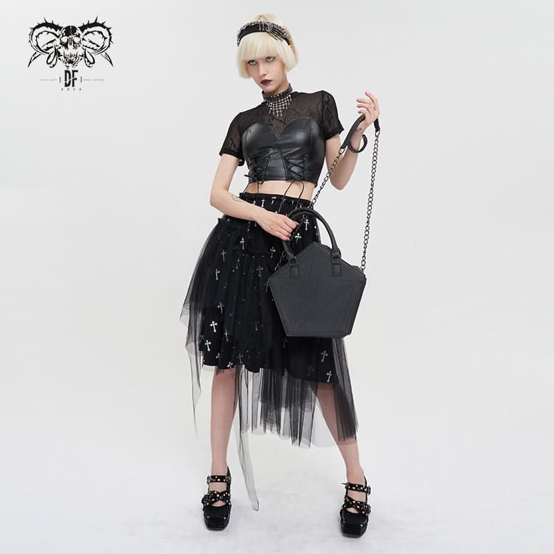 Unleash your inner rebel with the Mistress Of Hell Punk Mesh And Leather Spliced Crop Top. This striking piece blends edgy punk aesthetics with contemporary style, making it a must-have for any gothic fashion enthusiast. The top features a daring faux leather bodice that exudes confidence, complemented by a breathable mesh fabric that ensures comfort and style.