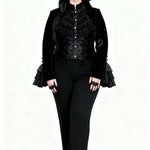 Crafted with attention to detail, this coat showcases intricate floral motifs that add a touch of elegance to your gothic wardrobe. The ruffled accents are enhanced with delicate lace, creating a captivating texture that draws the eye. Shank buttons with a silver illustration complete the look, providing a unique flair that sets this piece apart from the rest.