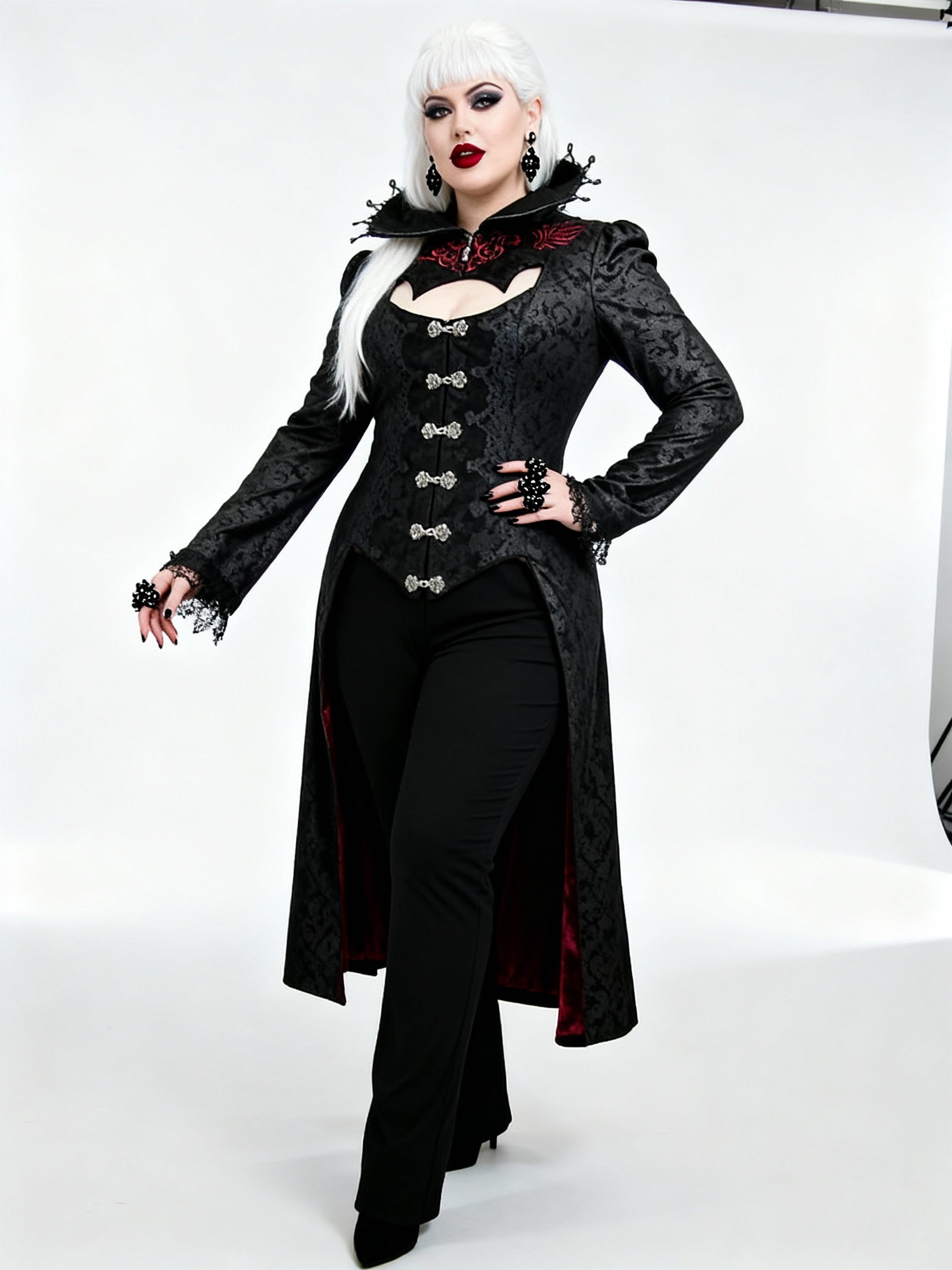 Embrace dark romance with the Scarlet Town Overcoat, where regal elegance meets rebellious spirit, adorned with lace and rich crimson embroidery.