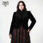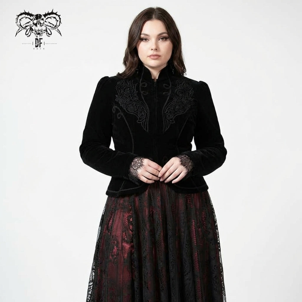 Der Brustbereich ist kunstvoll mit luxuriösem Samt appliziert, was die Gesamtästhetik unterstreicht und dafür sorgt, dass Sie überall ein mutiges Statement setzen. Dieser Blazer ist nicht nur ein Kleidungsstück, sondern eine Stil-Erklärung, die den Gothic-Spirit widerspiegelt. Perfekt zum Layern über Ihren Lieblingsoutfits, verbindet er mühelos Eleganz und Edge und eignet sich sowohl für legere Anlässe als auch für formellere Gelegenheiten.