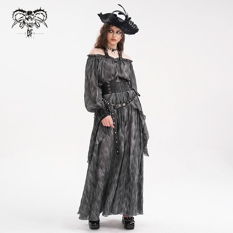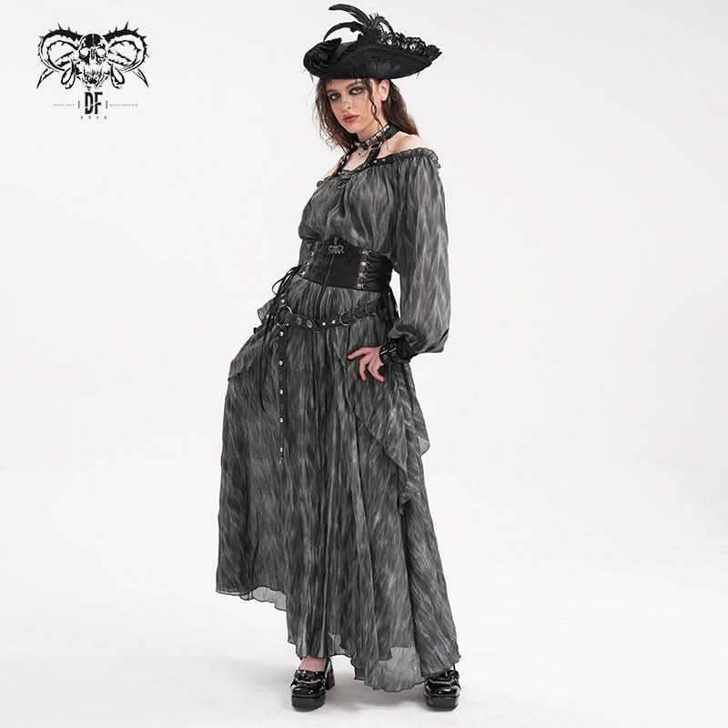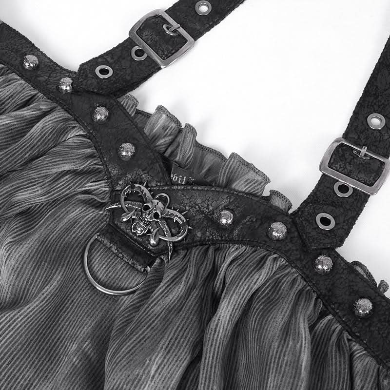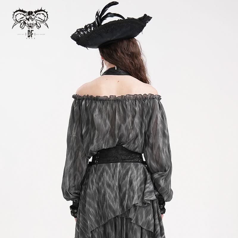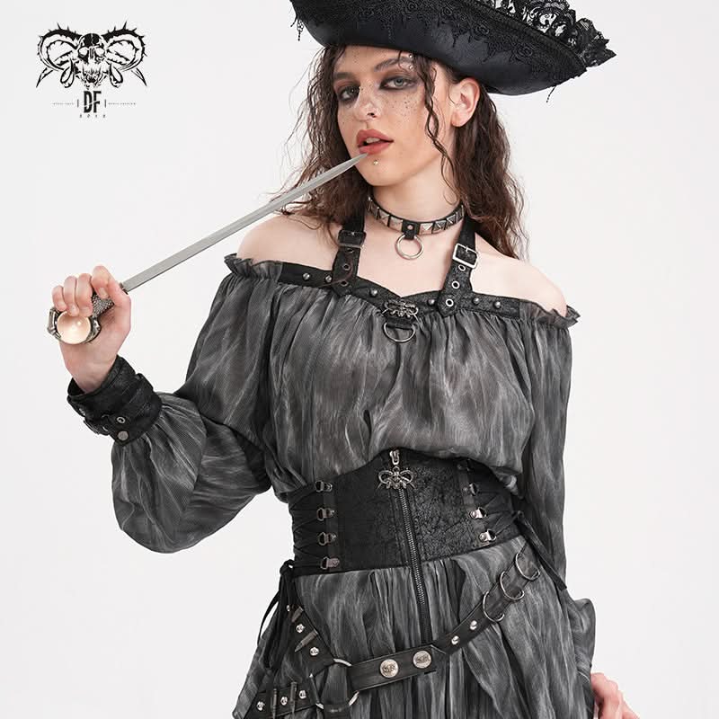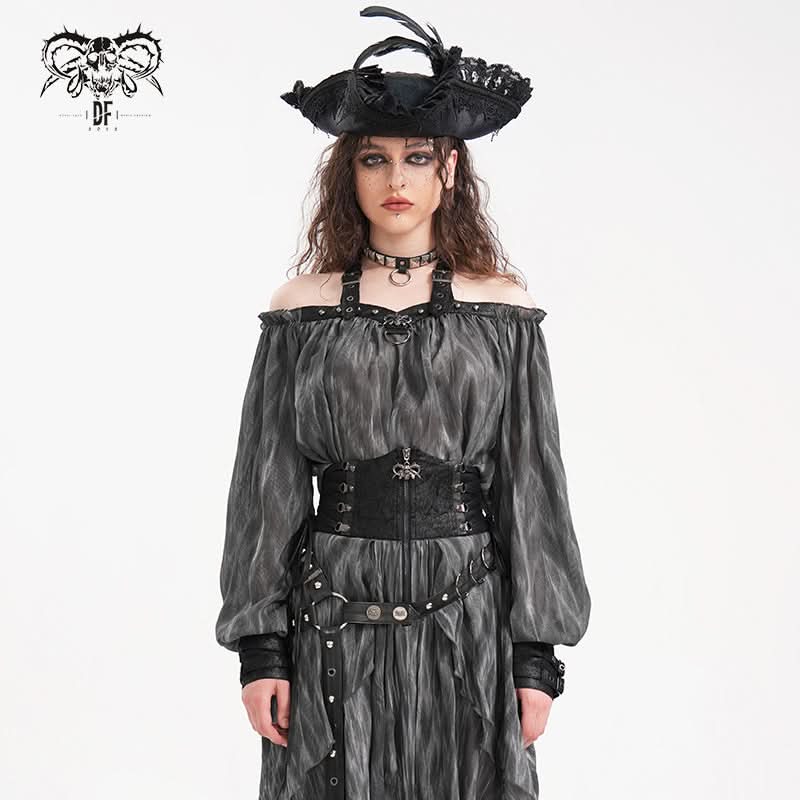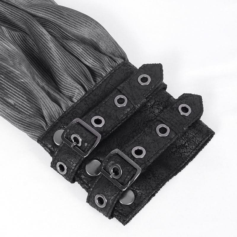 Featuring an off-shoulder halter design, cracked leather-like trim, metal studs, and long flowing sleeves, this loose-cut top evokes fog-shrouded streets and midnight rites perfect for visual-kei layering, alt ballads, or outfits that read like a nocturnal lament.