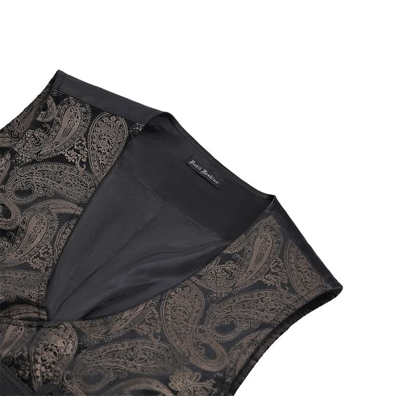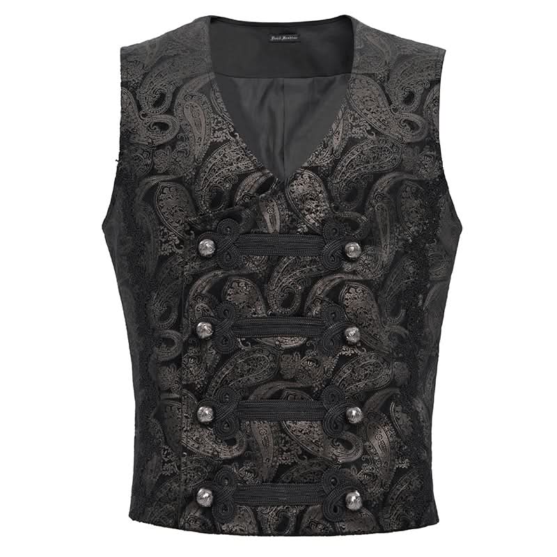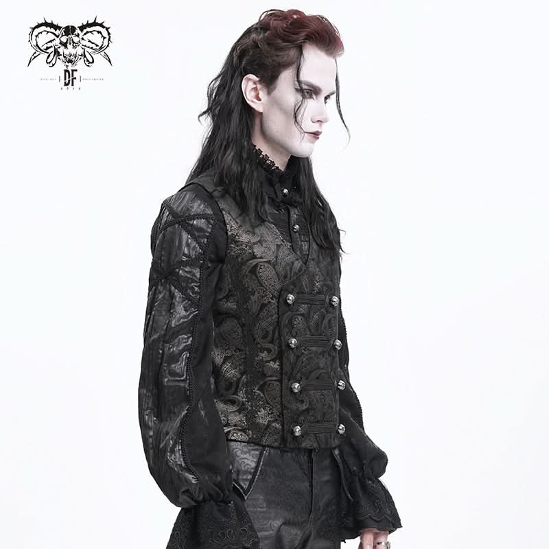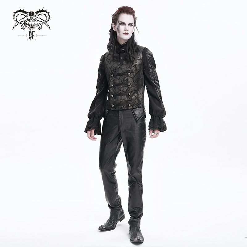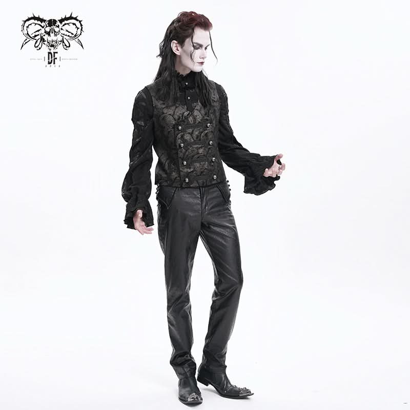 The Obsidian Alchemist Waistcoat is a sculpted gothic piece with rich embossed patterning that evokes arcane sigils and occult laboratories.