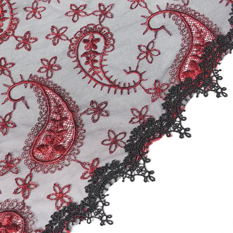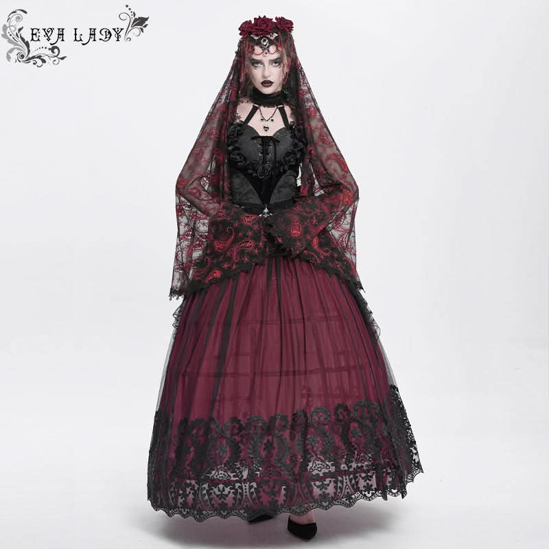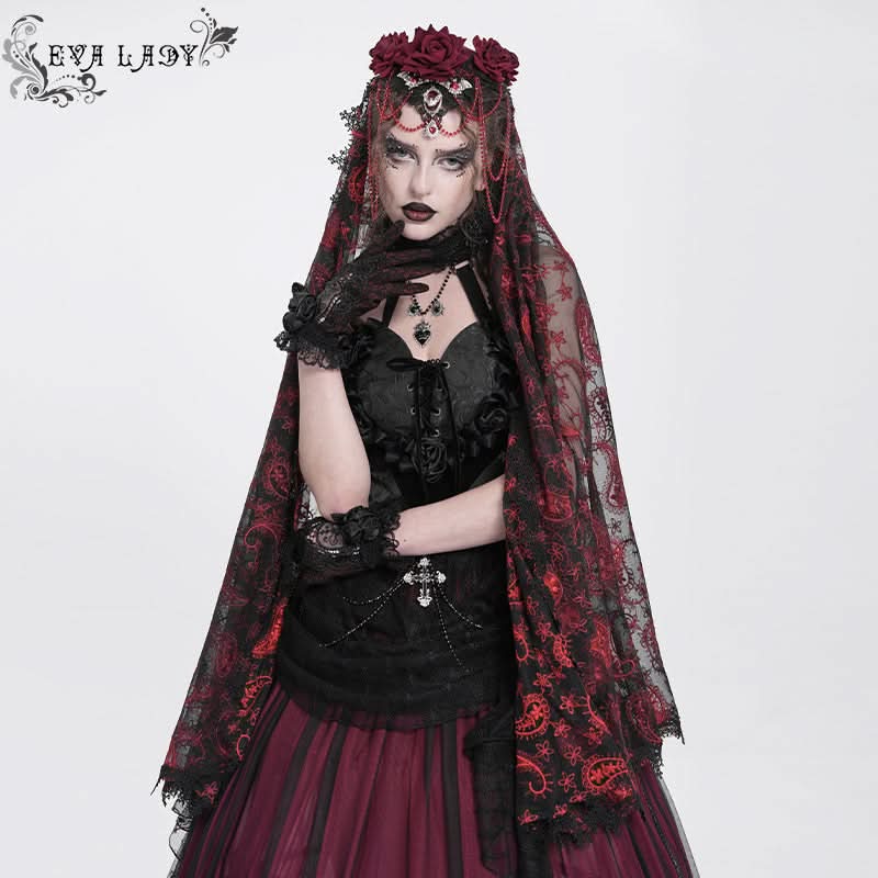 The Veil of the Scarlet Seraph is a fine‑mesh gothic veil detailed with paisley patterns and 3D rose accents that feel almost alive in the dark.