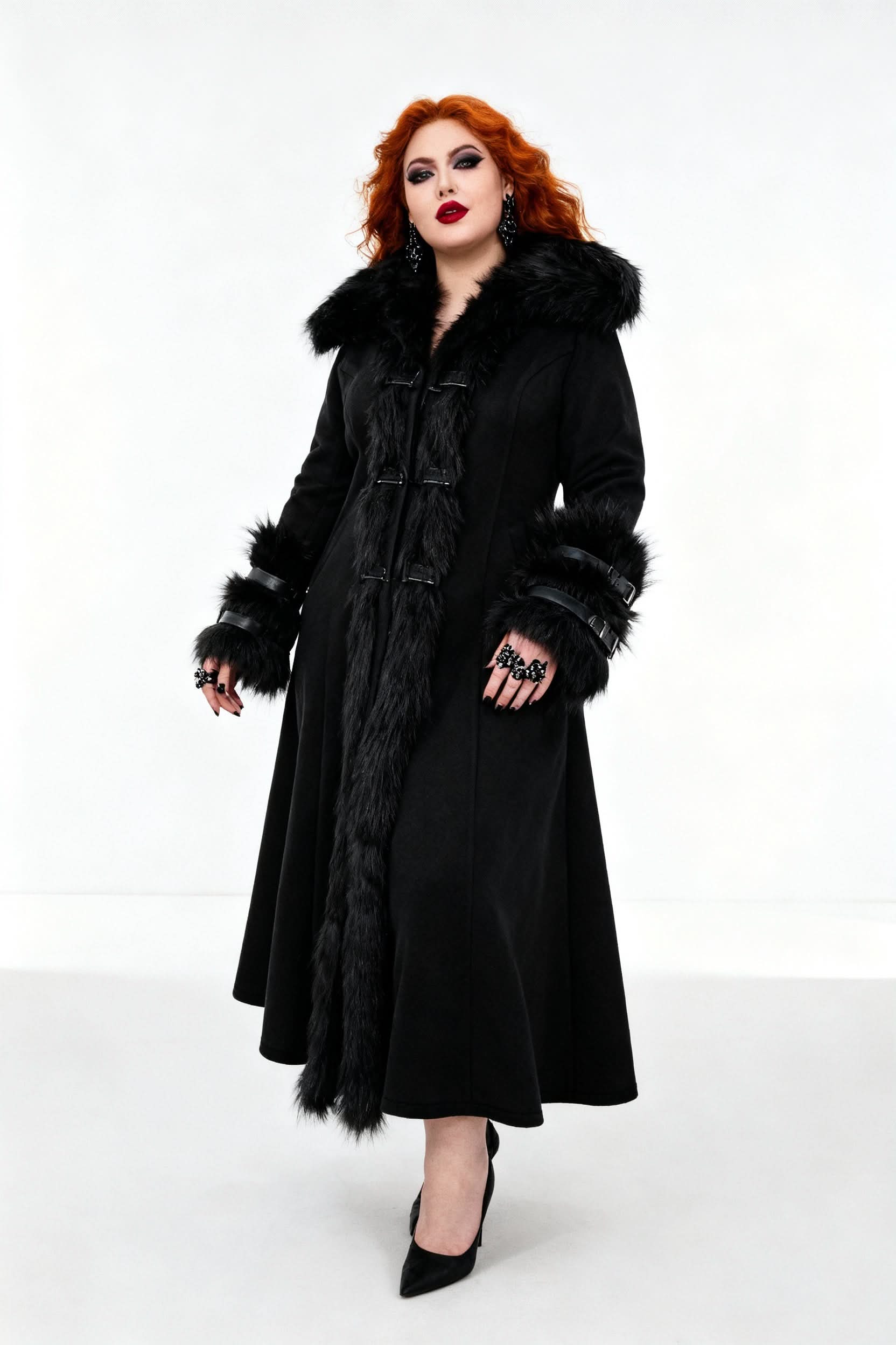 Wrap yourself in dark elegance with the Baroness Coat, where luxurious faux fur meets unparalleled style for the bold and the beautiful.
