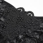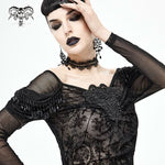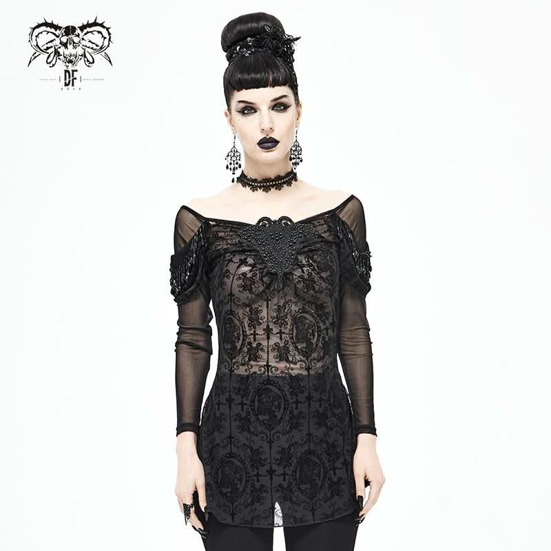 Embrace your dark elegance with the Shadow Song Gothic Mesh Top, featuring a stunning boat neckline that beautifully frames your collarbone. This gothic mesh top is designed for those who appreciate the allure of intricate details and unique textures. The fabric is elegantly embossed and adorned with beaded tassel webbing, adding a touch of mystique to your ensemble.